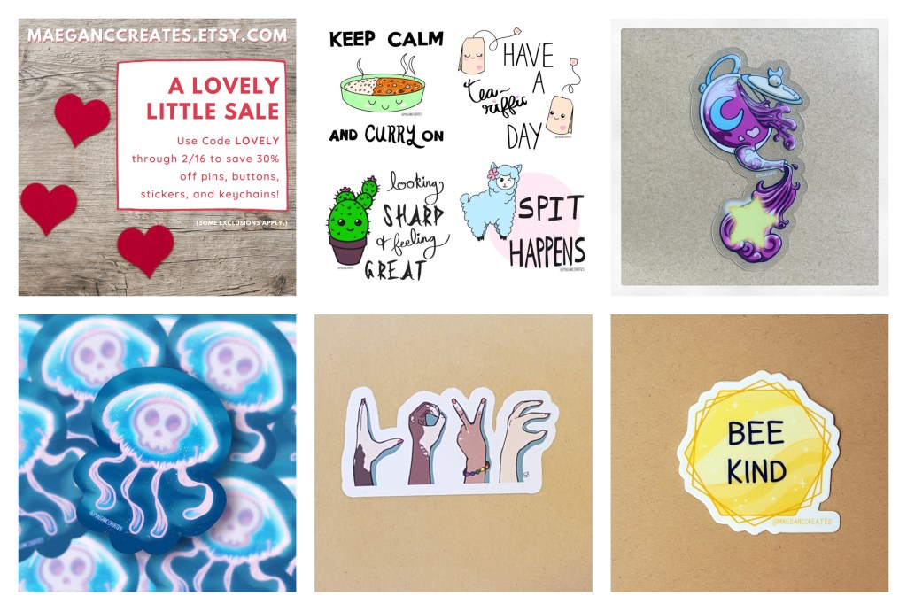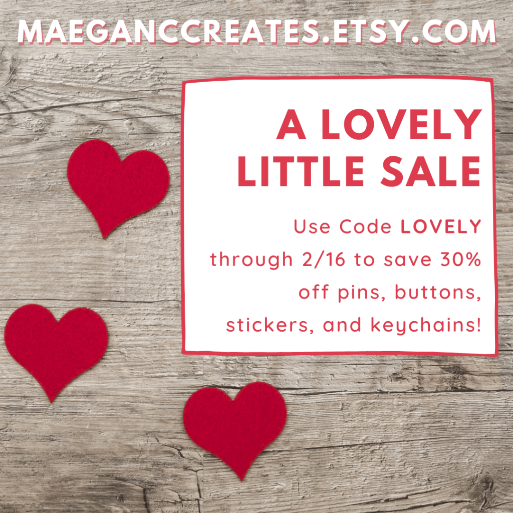 It’s the Lunar New Year this week and Valentine’s day– so I decided to throw a small sale in the shop, buttons/pins, keychains and stickers* are 30% off when you use code LOVELY. This even includes clearance items, because I got to move some inventory and make room for Spring orders as I’ve started churning out new designs. β€