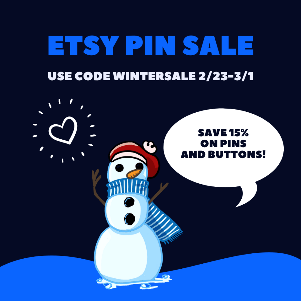 I am running a pins & buttons sale on the Etsy shop this week! I don’t usually run 2 sales in a month, but I’ve really got to make some more room for the new goodies coming in and prep for Spring. 😉